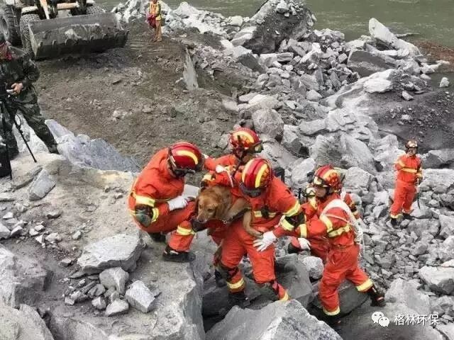 搜救犬小虎累得甚至走不动,需要救援队员们来抬。
