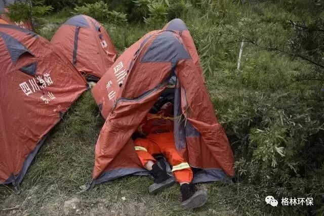 25日早晨,在茂县山体垮塌救援现场的一处观察哨,忙碌了一整夜后在大型机具的轰鸣声中,救援队员终于可以打一个盹了。