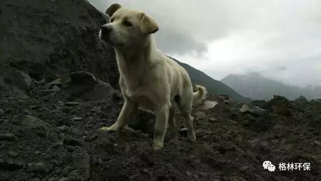 这只白色土狗,一瘸一拐,一直徘徊在崩塌现场的几块大石头上。
