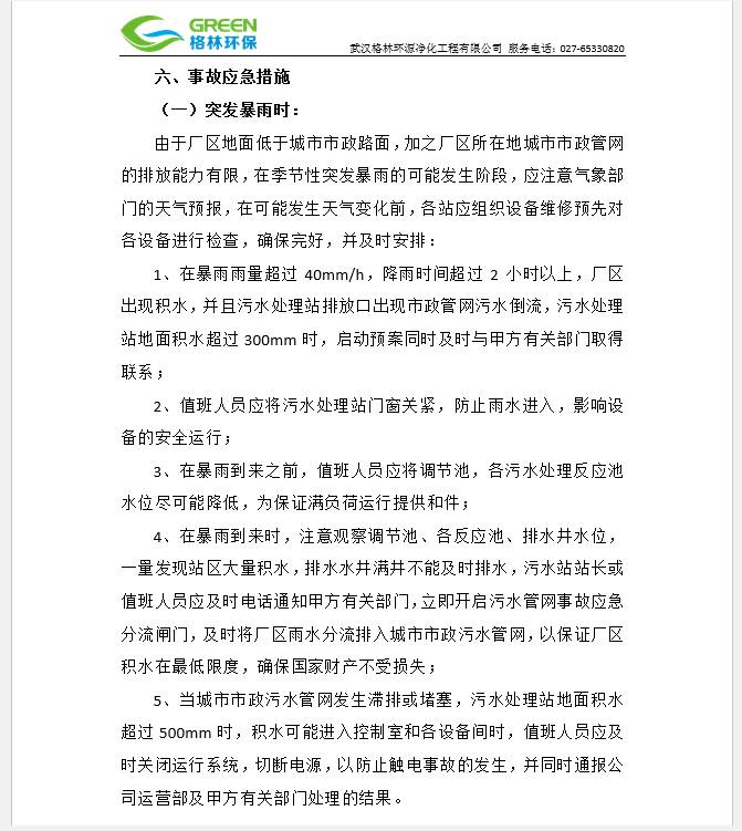 1、暴雨雨量超过40mm/h且持续2小时以上时,启动污水处理站暴雨应急预案,并与主要负责人及时取得联系;