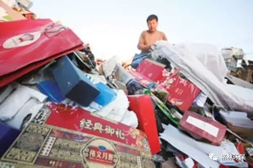 这样一看,包装礼盒产生的垃圾种类,就占了整个垃圾箱分类的一半。其实,大多数豪华包装中看不中用,最终只能扔掉,既浪费资源,还污染环境。而且好多包装里的海绵、塑料泡沫,难以降解,给垃圾处理带来难题。