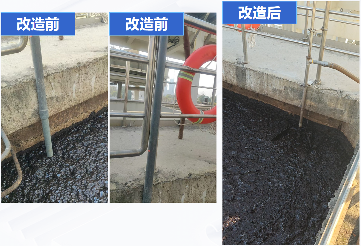 点评:通过对曝气管道的改造(添加三通及阀门),为好氧池死角提供曝气及搅动。改善好氧池运行状态,避免系统异常崩溃风险。净化现场空气。