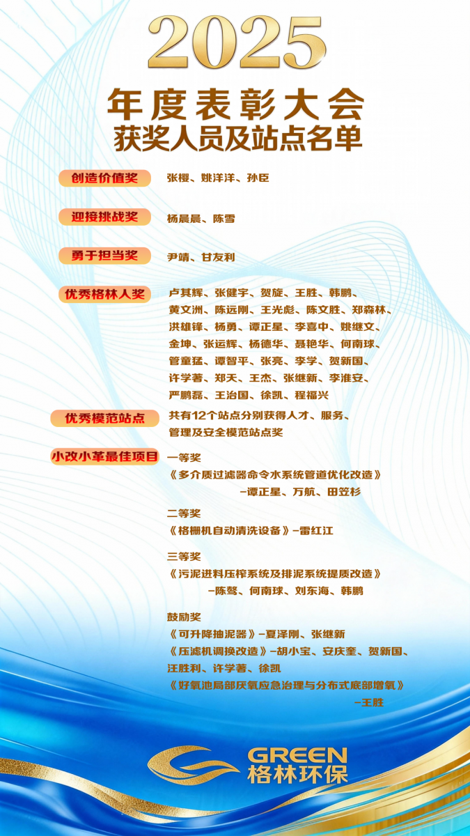 在格林环保运维的众多污水站点中,公司于2025年依据安全管理、人才建设、服务质量及标准化管理等维度,综合评选出12个“年度标杆站点”。多年来,我们由衷感谢客户持续提出的宝贵管理建议。正是在不断的自我提升与借鉴中,我们逐渐探索出一条独具特色的污水处理运营管理之路。