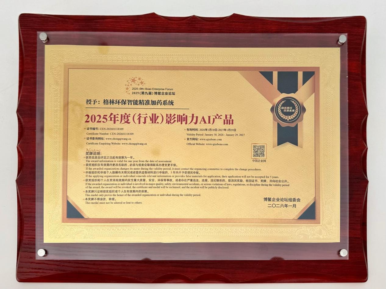 ▲格林环保AI精准加药系统荣获 “2025年度(行业)影响力AI产品”