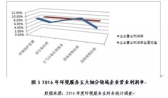 从盈利情况看,环境保护监测、水污染治理、大气污染治理、固体废物治理和危险废物治理五大细分领域中,仅固体废物治理和危险废物治理领域的2016年营业利润率较2015年有所提高,固体废物治理领域以10.4%的营业利润率成为五领域中盈利能力最高的细分行业,危险废物治理领域营业利润率同比增幅最高,约94.2%;环境保护监测、大气污染治理和水污染治理三领域的2016年营业利润率同比分别下滑18.9%、11.3%和9.0%。