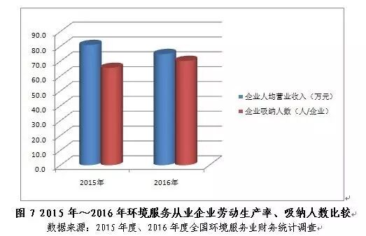 2016年,环境服务从业企业人均营业收入74.8万元,同比下跌7.5%。从业企业劳动生产率的小幅下滑可能与企业吸纳从业人数的增长有关,2016年业内企业平均吸纳人数为70人/企业,同比提高7.2%。