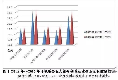 2016年企业缴纳的营业税金及附加、管理费用中的税金、应交增值税之和同比增长18.5%,达125.7亿元。五大细分领域中,水污染治理、危险废物治理企业分别以32.5亿元、31.9亿元位居五大细分领域三税缴纳额的前两位,分别贡献了三税总额的25.8%和25.4%。固体废物治理企业2016年缴纳三税总额同比增速最大,达37.0%,这可能归因于2016年我国城镇化的深入推进,带动了固体废物处理领域市场空间的不断扩大,以及该领域明显提高的营业利润率。